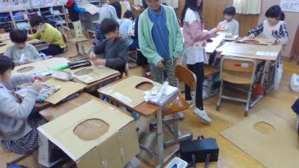 旅先、観光地などでよく見かける、顔をはめる板を作りました。様々なアイディアが思い浮かんだようで、あっという間に完成しました。楽しい板と満足そうににこやかな表情、最高にすてきです。