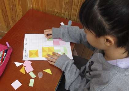 長方形、正方形、直角三角形の色紙を並べてもようを作る活動をしました。すきまなく並べるのが難しそうでしたが、形の組み合わせや向きを考えながら、いろいろなもようを作ることができました。