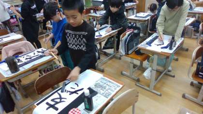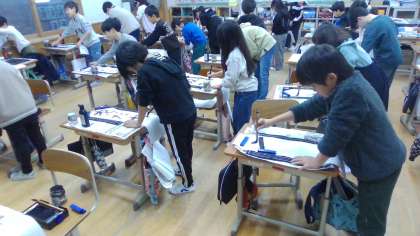 いつもと違う紙に、いつもと違う姿勢で、とまどうこともありましたが、1枚2枚と練習するうちに上達してきました。いつもの半紙が画仙紙に変わったことで、文字の大きさには苦労しましたが、立って書いたことで筆が立ち、いつもよりすてきな字が書けました。