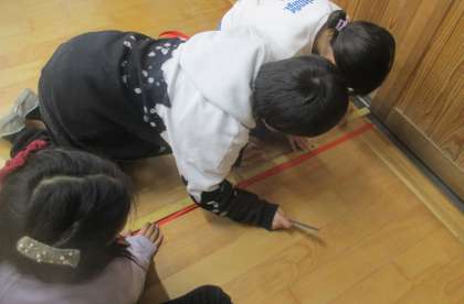 長さの学習で、両手を広げた長さを紙テープにうつしとり、長さをはかる活動をしました。「テープの長さをはかるためにはどうしたらいい?」と問いかけると、「30cmものさしやじょうぎをつなげる!」「それって大変そう・・・」「長いものさしがあったらうまくはかれそう!」など、みんなで長さのはかり方を考えました。その後は、3人で協力しながら100cmのものさしを使って長さを調べることができました。