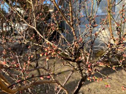 そんな中、学校の梅のつぼみが少し膨らんでいるのを発見しました。