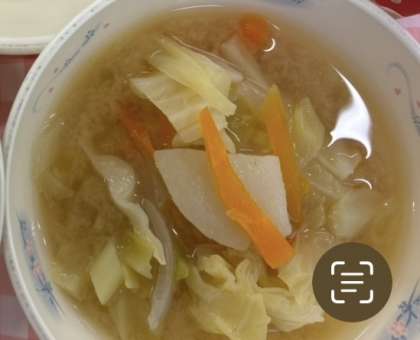 今日の「春野菜のみそ汁」には、たまねぎやキャベツなど、春野菜がたっぷりと入っていました。