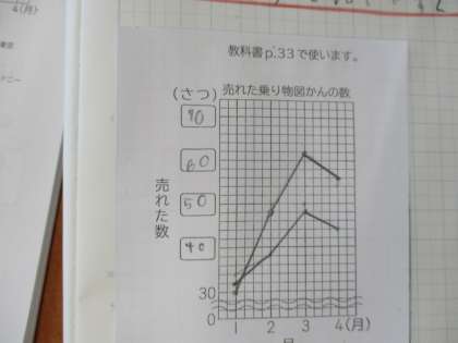 折れ線グラフでは、2つのグラフを読み取る学習や、重ねて書く学習をしました。班で協力して、合っているか確かめることができていました。