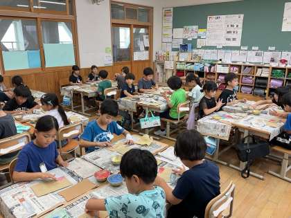 2年生の図画工作科では「とろとろえのぐで」の学習をしました。液体粘土に、赤・青・黄の絵の具を入れ、指で混ぜたり絵を描いたりしました。とろとろした絵の具の感触を楽しみながら、色と色を混ぜたり、絵に表したりできました。