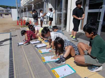 方位磁石を使って方位を確認しながら、太陽の位置を予想したり、遮光板を使って太陽を見てみたりしました。