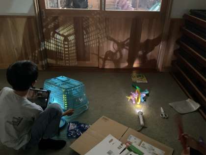 子どもたちは、光の当て方や角度を工夫しながら、思いがけない形や色の広がりに驚き、友達と見せ合いながら新しい発見を重ねていました。光と影の世界を探検する中で、表現の面白さや空間の変化を感じ取ることができました。