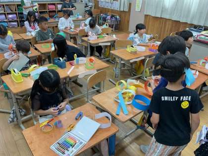 2年生の図画工作科「わっかで へんしん」の学習では、ホチキスとテープを使って「わ」を作り、頭に被ったり、からだに巻いたりしながら、飾りつけをしました。
