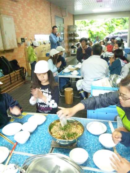 おいしい豚汁と焼きそば、焼おにぎりができました。いっぱい食べて、みんな満足、満足! 地域のみなさん、ありがとうございました。
