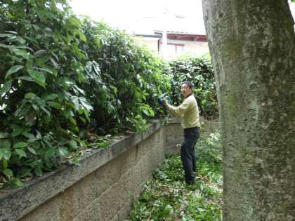 電動の剪定機で正門の伸びきった植木をどんどん切っていく