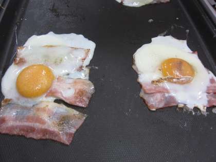 ベーコンエッグを作りました。味はもちろん「おいしーい!」