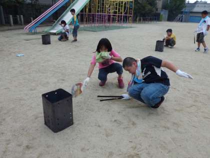 野外炊事の火の係の人達が、実際に学校にある小さな移動式かまど