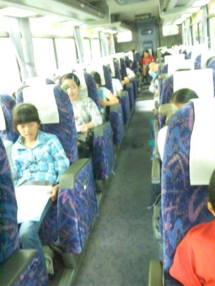 バスの中は楽しいゲームと歌で盛り上がっています。