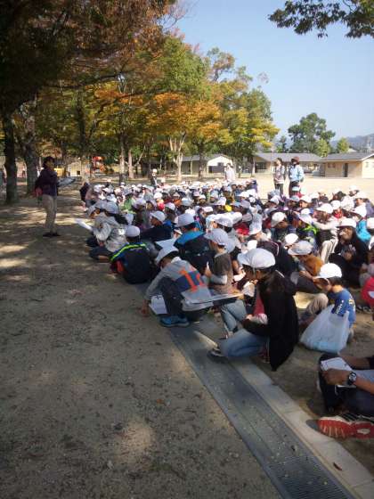 縦割りグループごとに出発します。宝ヶ池の5つのボイントをまわっていきます。さて、問題がうまくとけるかな?