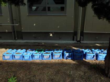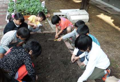 夏のミニトマトを収穫した植木鉢に,今度は二十日大根の種をまきました。小さな種を,やさしく丁寧にまきました。その後,みんなで畑を耕して,畑にも種をまきました。早く芽が出るといいですね。