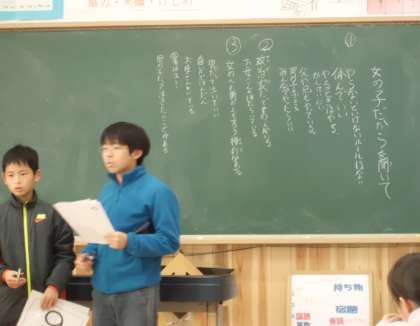 教室に入ってから,たてわりグループのみんなで,「おんなのこ だから」の絵本の感想を交流しました。「家事を女の子がするのは当たり前?」など,男の子と女の子の役割などについて意見を出し合いました。子ども達からは,「できる人がやったらいいと思う。」「女の人だって仕事をしているから,男の人もやればいい。」「男とか女とか関係ないと思う。」などの意見が出ていました。家庭によって,事情や条件はいろいろ違うと思いますが,おうちでも,この学習をきっかけに話し合ってみてはいかがでしょうか。