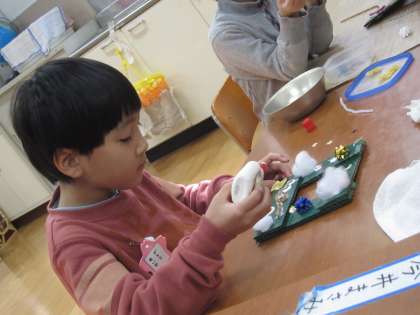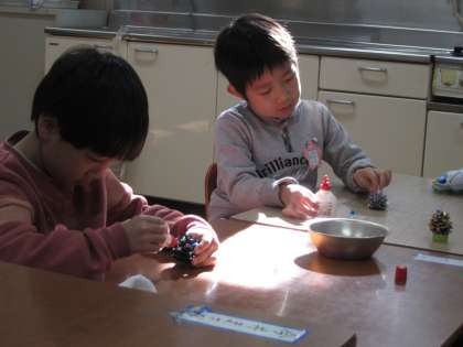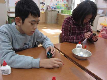 まつぼっくりのすきまにビーズをつめていく細かい作業も,みんな真剣!