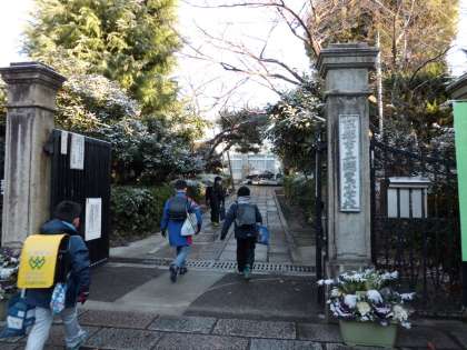 正門の木々の上も雪が積もっていました。