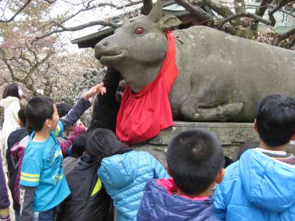 2月25日,北野天満宮で梅花祭が行われました。3年生のみんなは,地域のお祭りの様子を見学するために,天神さんへ出かけました。しばらく待っていると,冠に菜の花をつけて(菜種が宥(なだめる)に通じる)祭典に奉仕する神職の方々が出てこられてお祭りが始まりました。その後,みんなは,「喉が良くなりますように。」「かしこくなったらいいなあ。」などと言いながら,腕を伸ばして神牛の石像をなでたり自分の体をなでたりしていました。牛の背にも,梅はきれいに咲いていました。