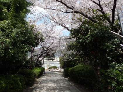 ほんのり、花びらのじゅうたんができはじめた校門からの石畳の上を