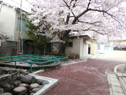 本館前の池には、水面にきれいに花びらが浮かんでいます。