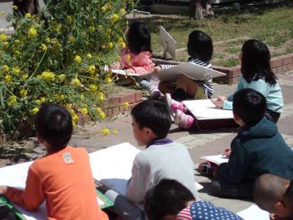 花壇にたくさん咲いている菜の花を、みんなでじいっと観察して、コンテで画用紙に描いていきます。