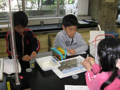 前半は,センターの川の水を使って「水質検査」をしました。透視度計を使ってにごり具合を見たり,CODという薬を使って水に溶け込んでいるものがあるのかを調べました。透明に見える水にも溶けているものがあり,魚にはそれがしんどいのですよと教えていただきました。