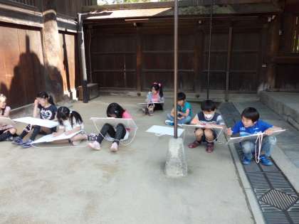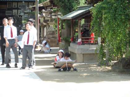 たくさんの観光客の中、自分の描きたい場所を決めて子ども達は描き