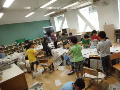 フリールームをいっぱいに使って、新聞紙をつないで屋根にしたり、丸めてねじって柱にしたり、形を切って飾りにしたり…。