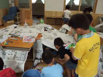2年生は図画工作科で、新聞紙をたくさん使って造形あそびをしました。
