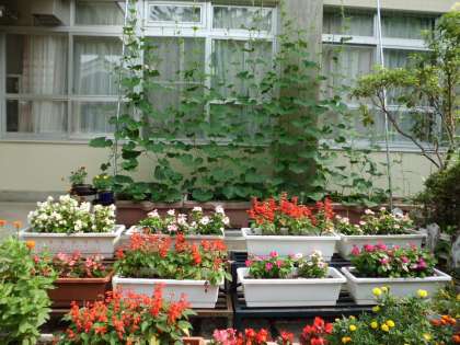 玄関前には、栽培委員の子ども達が一生懸命育てた百日草や