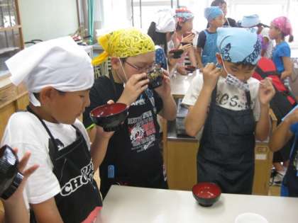 総合的な学習で京料理の体験授業をしました。地域の「おかもと紅梅庵」さんにお越しいただき,豚汁とおにぎりを味わいました。昆布だしとかつおだしの味と香りの深まり,梅干しとご飯の相性のよさに子どもたちは感心して食べていました。