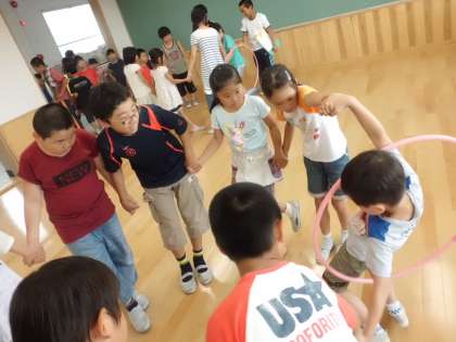 <フラフープくぐり>、校内の移動、<ジェスチャーゲーム>の様子です。
