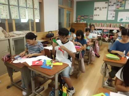 5年生は,毎年民生委員の方と一緒に,地域の米寿を迎えられたお年寄りの方のお宅を訪問します。今,その時にお渡しする,飛び出すカードを作っています。カードを開くと,お祝いの言葉やケーキが飛び出します。相手の方に喜んでいただけるように,みんな工夫をしています。米寿訪問は,9月12日(金)の午後です。