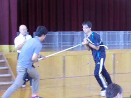 まず,職員室にいた者がさすまたや竹ぼうきを持って対応し,その間に児童を体育館に避難させました。訓練の後,体育館に集合した児童に警察の方が,教室や廊下に置いてあるさすまたについて説明をしてくださいました。また,私たち教職員には,効果的なさすまたの使い方や,不審者への対応の仕方などを指導してくださいました。