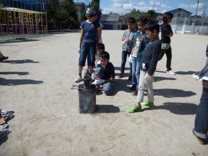 運動場では、かまどの作り方から、ごはんの炊き方までいろいろ