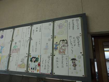 中に入ると、掲示板にいは『給食カルタ』が目に入ります。