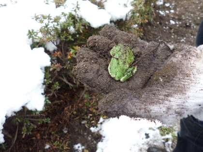 校内清掃で畑を掘り起こしていると、なんと冬眠中のカエルを見つけました。