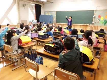 教室では、担任の先生にランドセルの置き場所や