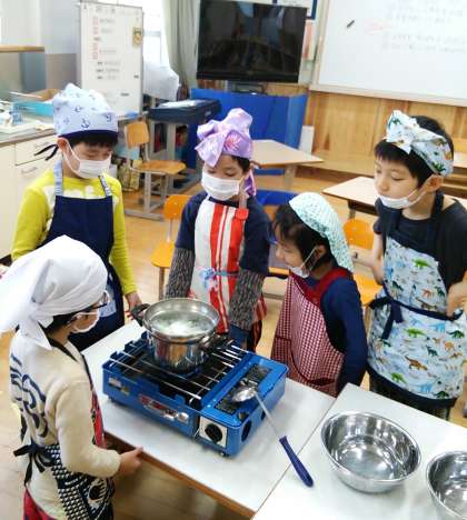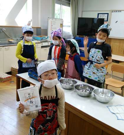 よもぎの葉っぱを入れたお団子をお湯の中に入れてしばらく待つと,ぷかぷかとお団子が浮いてきました。食べるのが楽しみです!!