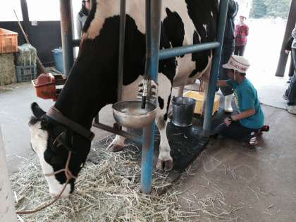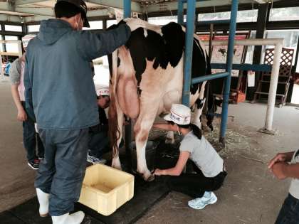 淡路島牧場で乳搾りを体験しました。ちょっとこわごわ!でも、貴重な体験です!