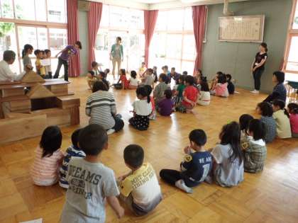 初めは幼稚園の遊戯室に集まり、グループの名前を決めました。「もも」「パイナップル」「いくら」「からあげ」などおもしろい名前がたくさん。