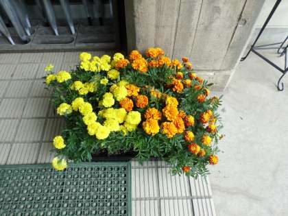地域の方からすてきなマリーゴールドの花かごが玄関に