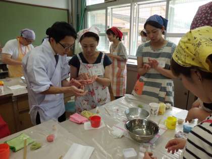 老舗「老松」さんにきていただいて、和菓子作りに