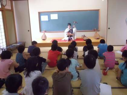 そこで,校区にお住まいの筑前琵琶奏者の谷口旭佳様に,「平家物語」や「那須與一」を聴かせていただくことになりました。毘琶の伴奏で聞く平家物語は物悲しく,心に響きました。みんなも,先生の伴奏で一緒に歌わせていただきました。