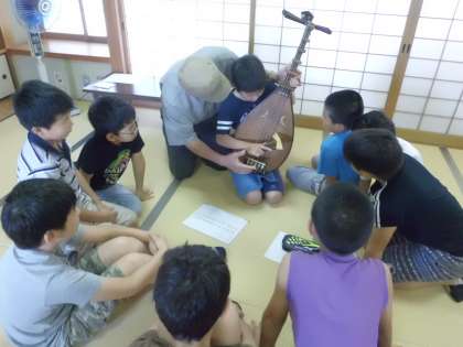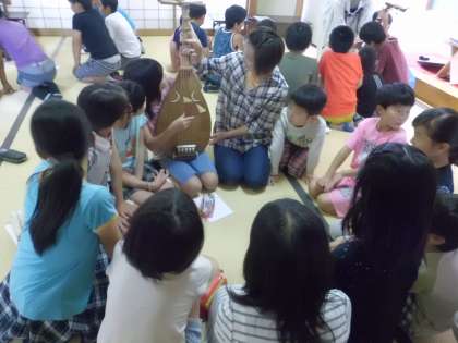 最後に,一人ずつ毘琶を持って弾かせていただきました。大きなばちで弦を弾き,初めての音を楽しんでいました。