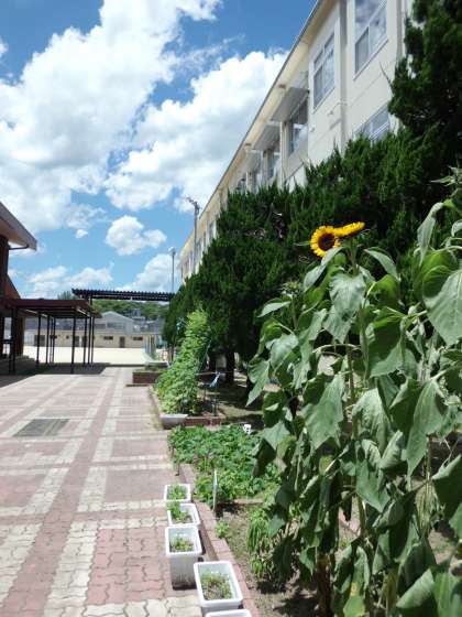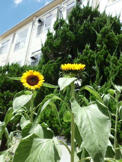 中庭のひまわりが、太陽に向かって元気に花を