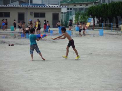 運動場では、水鉄砲で水をかけまくり、びしょぬれになりました。