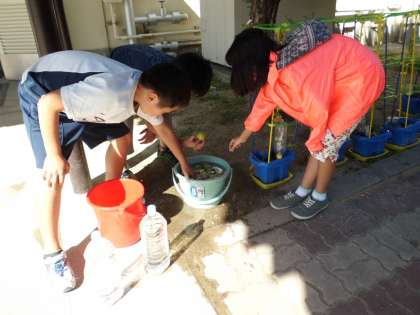3年生の学校園には、かわいい瓢箪がすずなりに