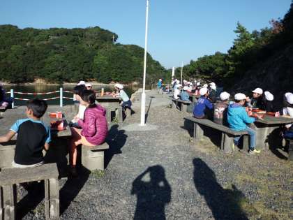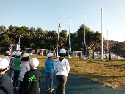 朝のつどいを営火場でしました。