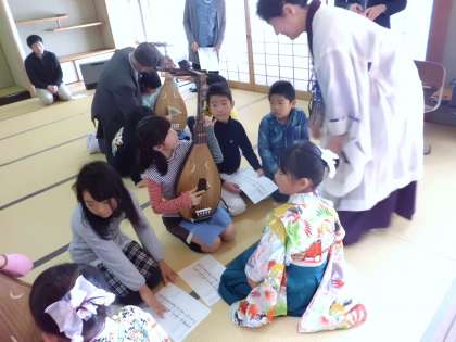 お父さんやお母さんも,担任の先生も,一緒に体験させていただきました。そして,琵琶に合わせて唄の練習です。「平家物語」の出だしの部分を,「祇園精舎の鐘の声〜」と,みんなで声を合わせて練習しました。低学年の人には意味は分からないけれど,先生について一生懸命に唄っていました。